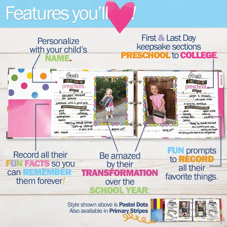 ❤️CAPTURING YOUR CHILD'S SCHOOL MILESTONES is easy with the templatized pages of the . This First & Last Day of School Memory Book Keepsake Album is 72-pages (includes 16 full-size pockets) for school grade levels Preschool to College. Easy-to-remove pages for grades you don't use!